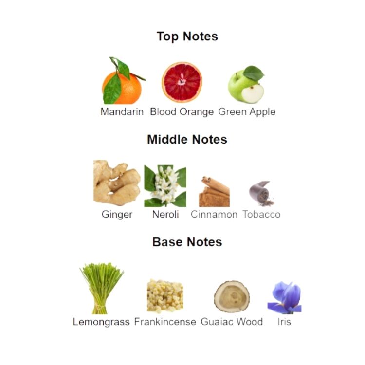 • Cœur : Gingembre 🌶️, néroli 🌼, cannelle 🌿, tabac 🍂