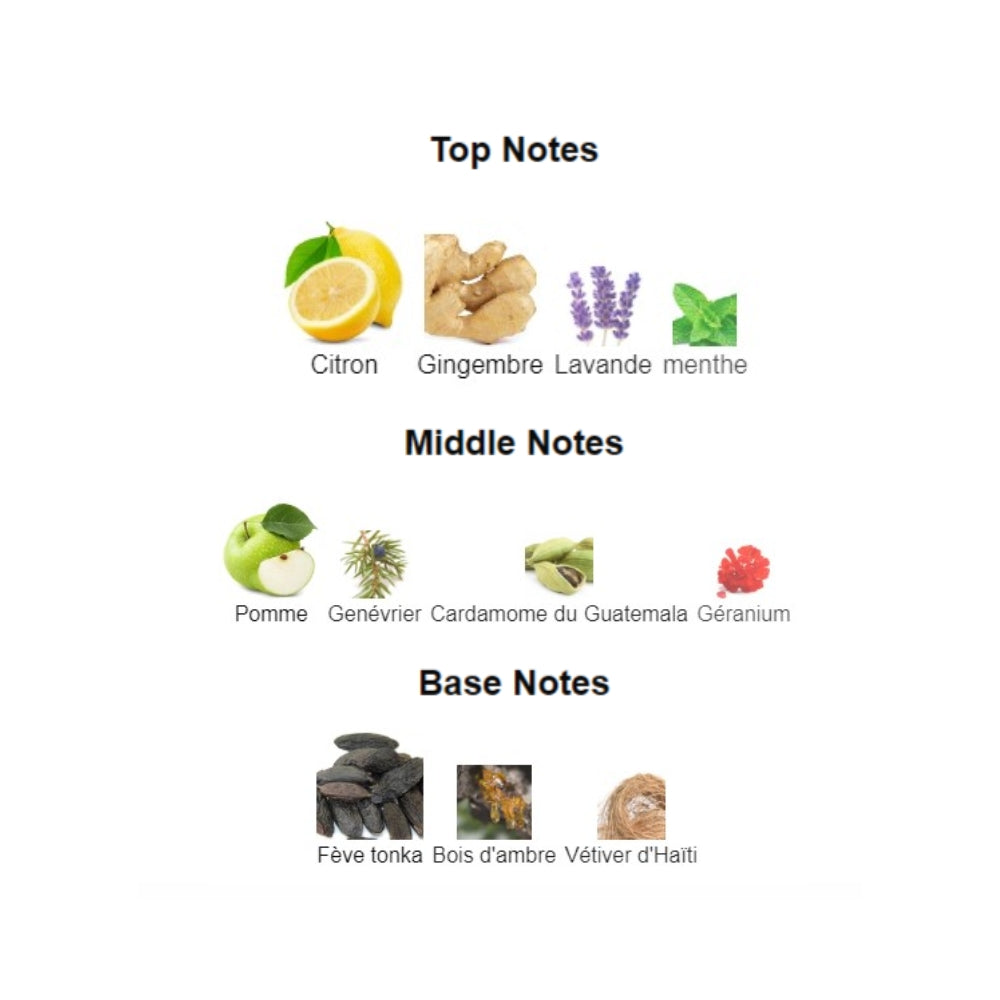 ‱ TĂȘte : Citron zestĂ© 🍋, gingembre Ă©picĂ© đŸŒ¶ïž, lavande aromatique 🌿, menthe fraĂźche 🍃