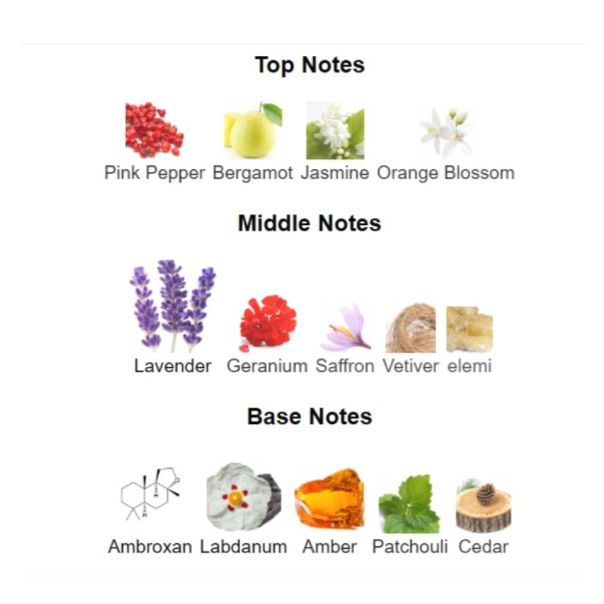 • Cœur : Lavande 🌿, géranium 🌺, safran 🔥, vétiver 🌱, élémi 🌳