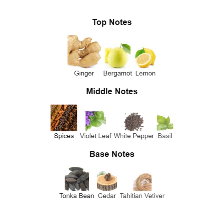Tête : Gingembre épicé 🌶️, Bergamote pétillante 🍋, Citron frais 🍋