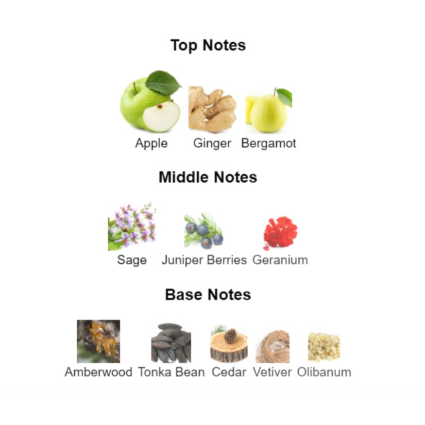 • Tête : Pomme croquante 🍏, Gingembre épicé 🌿, Bergamote fraîche 🍋