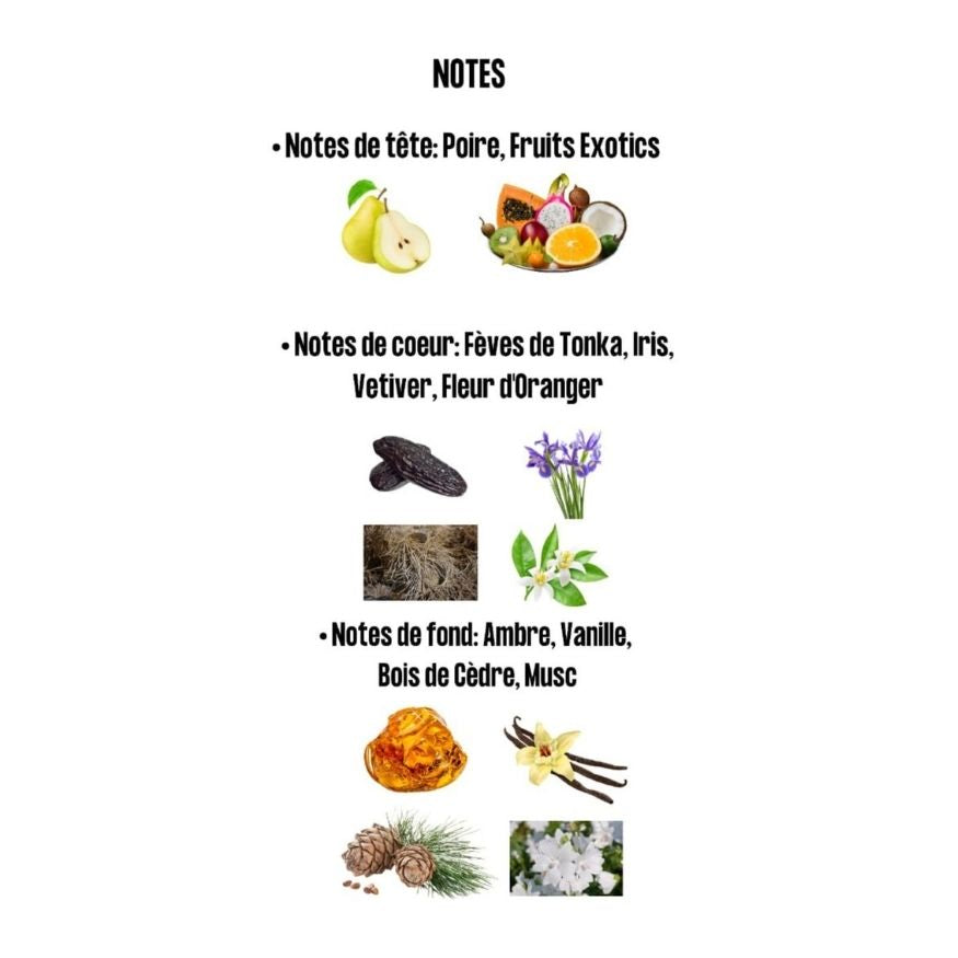 • Notes de tête : Poire 🍐, Fruits exotiques 🌴