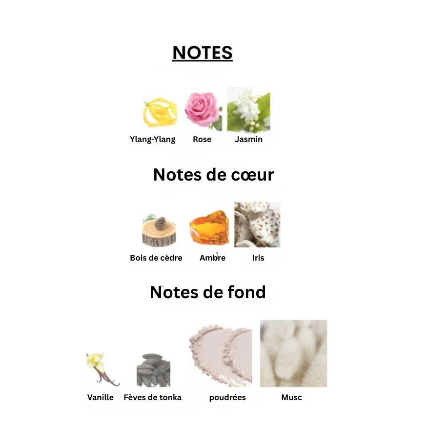 • Tête : Jasmin 🌸, Ylang-Ylang 🌼, Rose 🌹