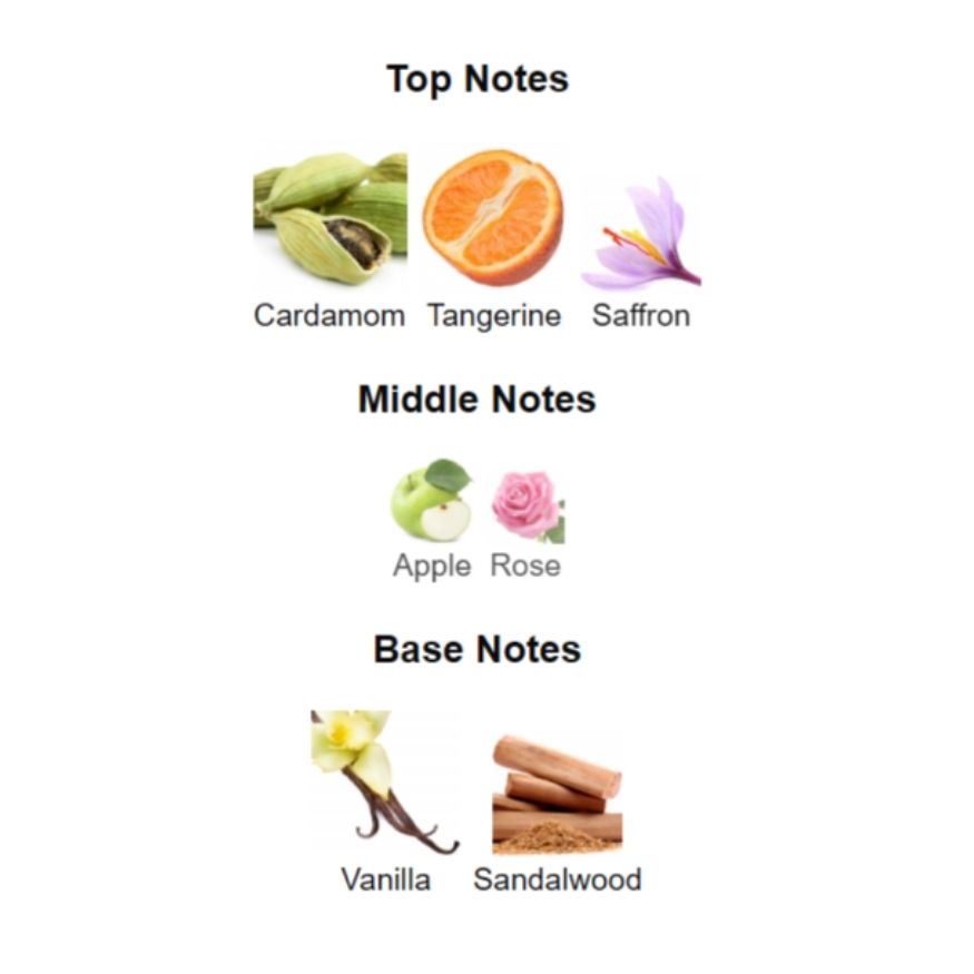 Notes de tête : Cardamome épicée 🌿, mandarine pétillante 🍊, safran précieux ✨